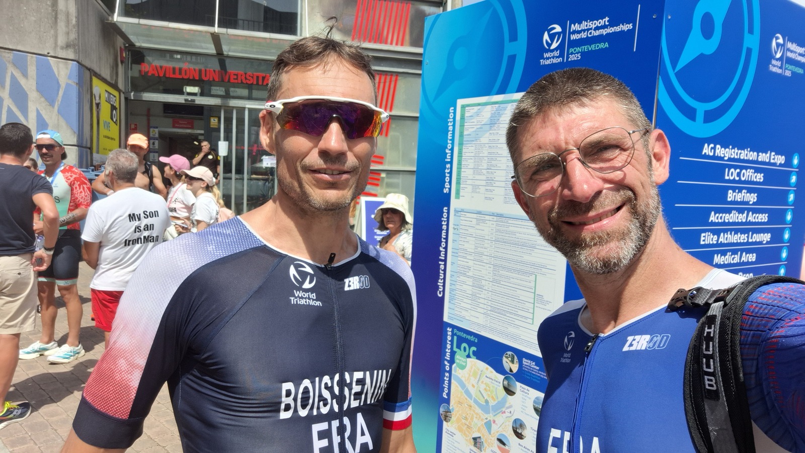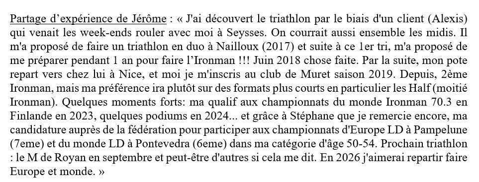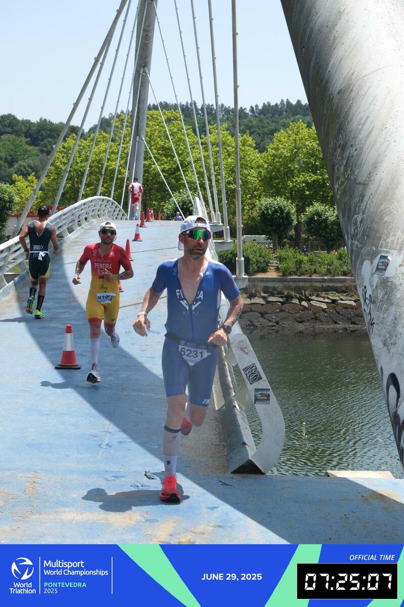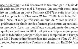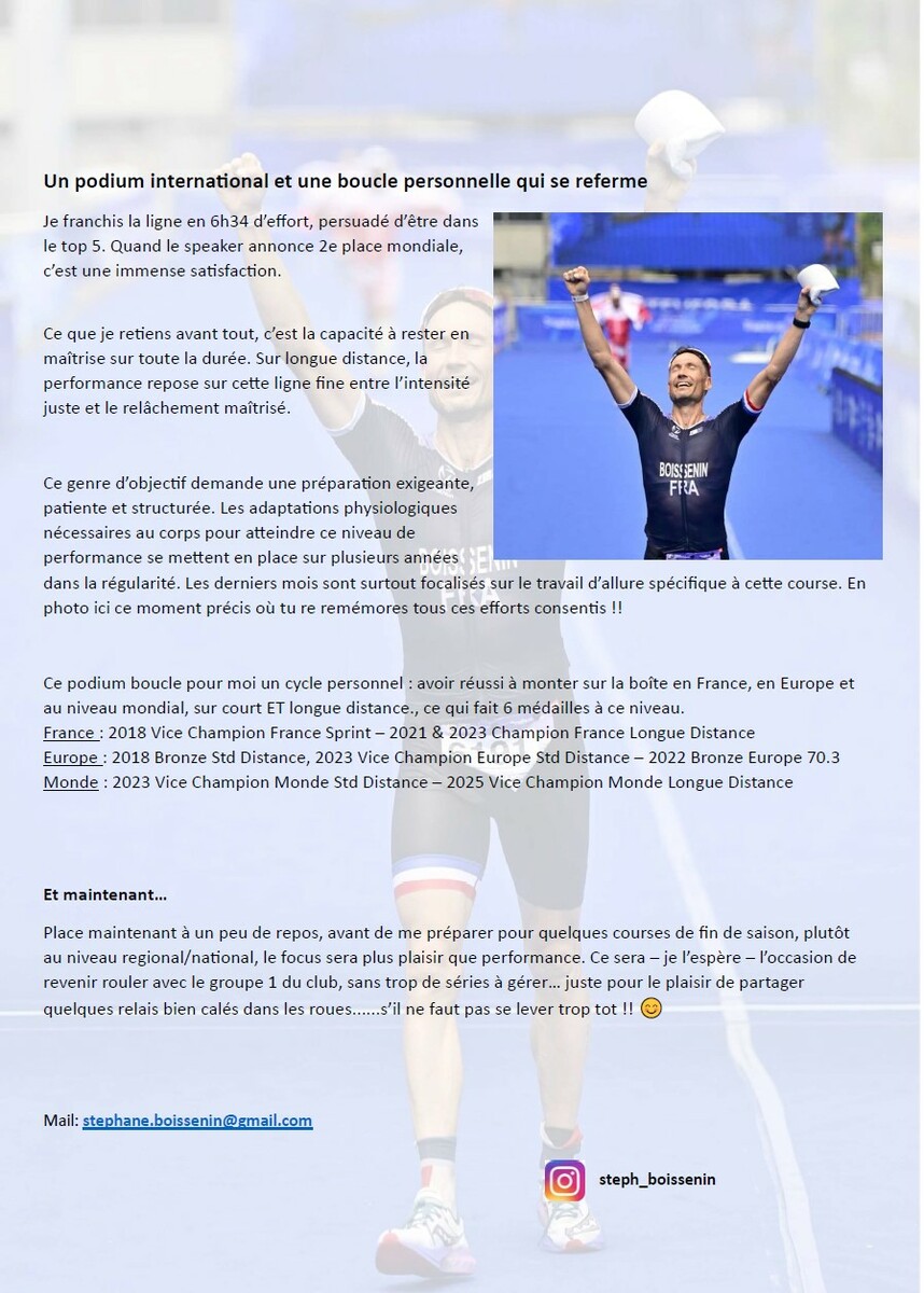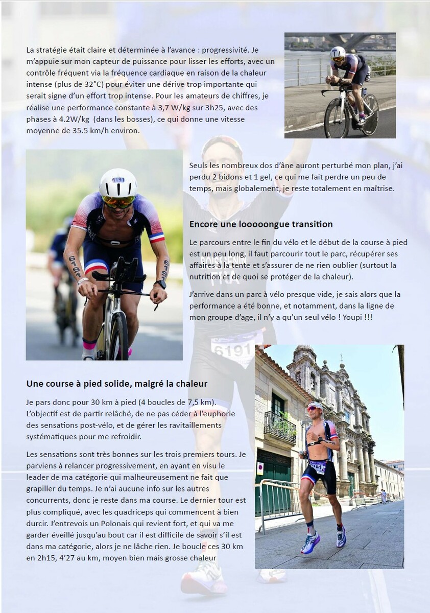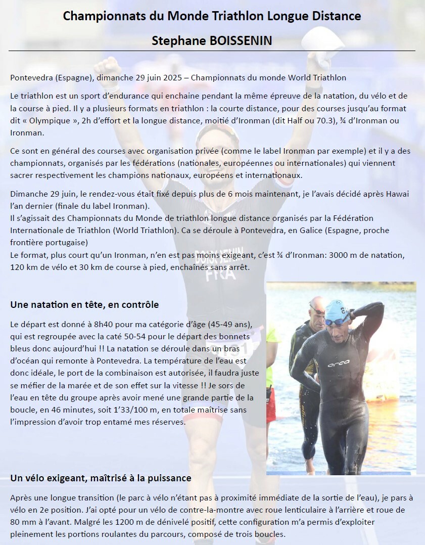 2 fidèles du G1 au championnat du monde de triathlon longue distance ! đđȘ : Ils ont troqué un temps leur cuissard de cyclo SVC pour enfiler la tri fonction… et pas pour n’importe quel défi ! Après des mois de préparation exigeante, Stéphane Boissenin et Jérôme Brut Bonnefoy ont brillamment participé au Championnat du monde de triathlon longue distance à Pontevedra, en Espagne. Au programme : 3 000 m de natation, 120 km de vélo +1200D avalés à vive allure entre 32 et 35,5km/h, puis 30 km de course à pied sous un soleil de plomb… rien que ça ! âïžđ„ Une performance d’exception qu’ils ont accepté de partager avec nous. đ Retrouvez ci-dessous quelques photos, ainsi que leurs retours d’expérience, entre émotions, dépassement de soi et souvenirs inoubliables. Bravo à eux pour ce magnifique exemple de courage, de discipline… et de passion !